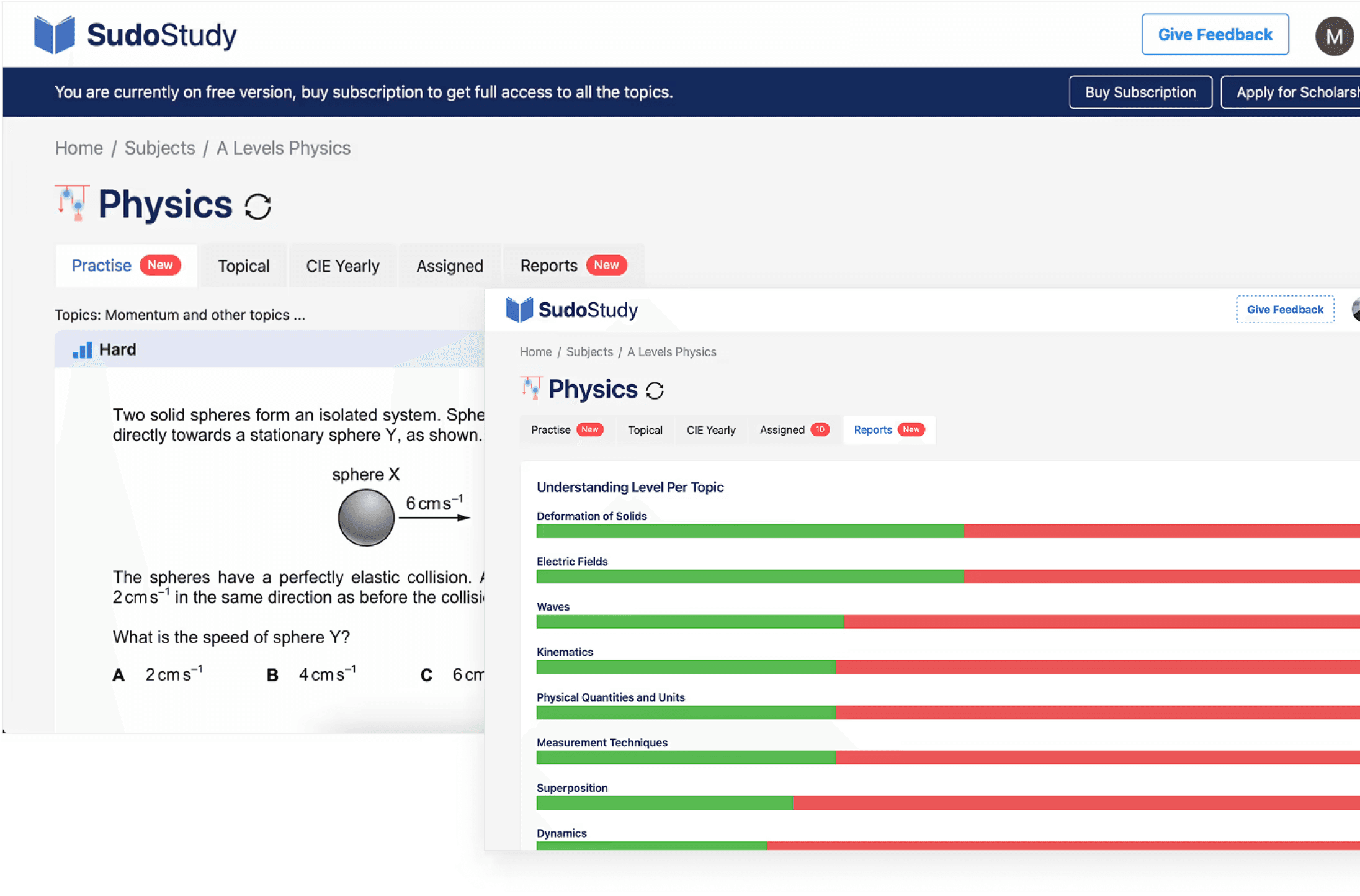 The original subject view hit students with five tabs, a difficulty label with no context, and a practice question, all before telling them how they were actually performing. A separate reports screen showed colored bars per topic with no scoring framework, no recommendations, and no connection to what the student should do next. Students had to visit multiple screens and mentally piece together their own progress. Most didn't bother.