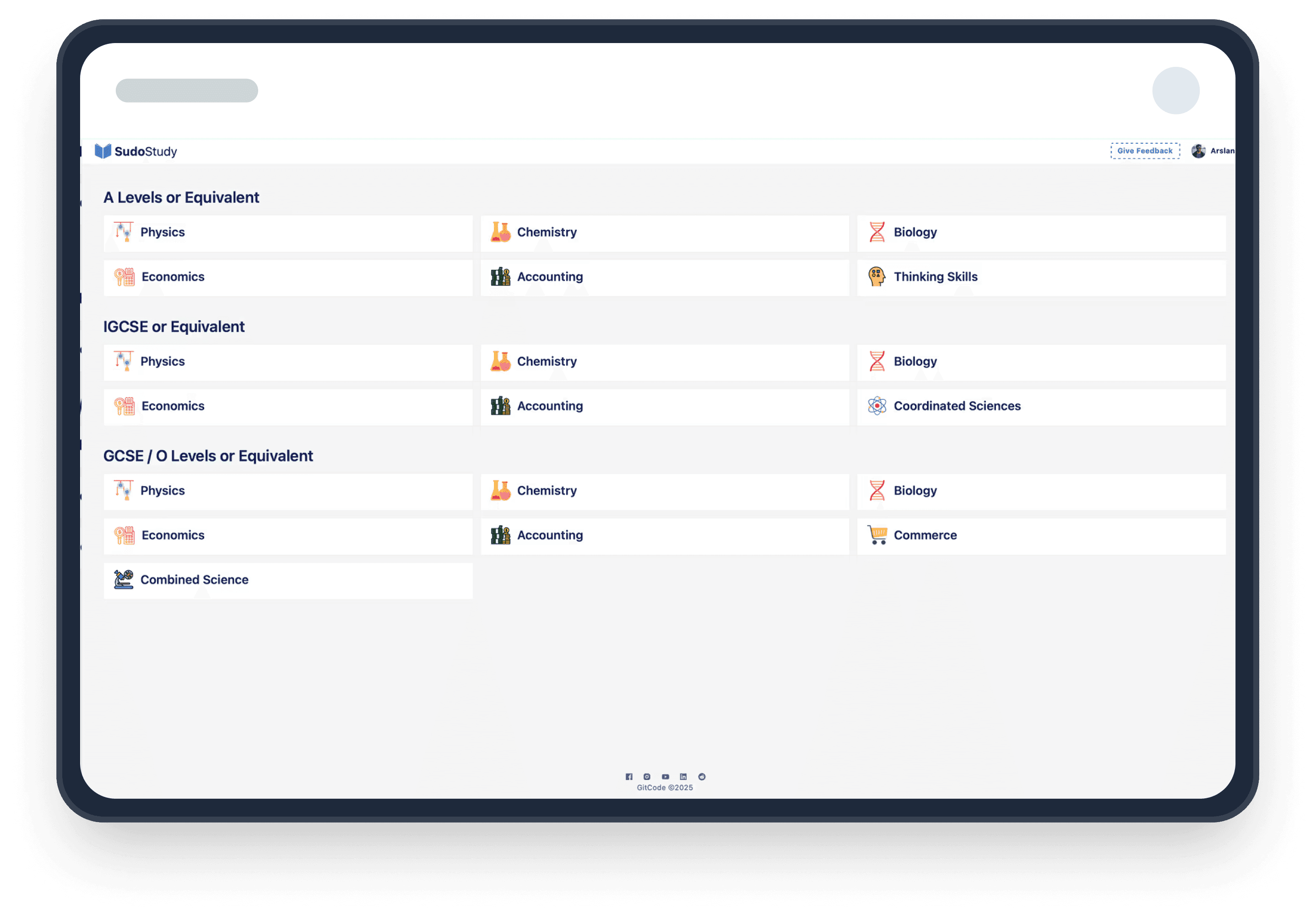 Rapid subject/level selection lands users on a relevant dashboard.