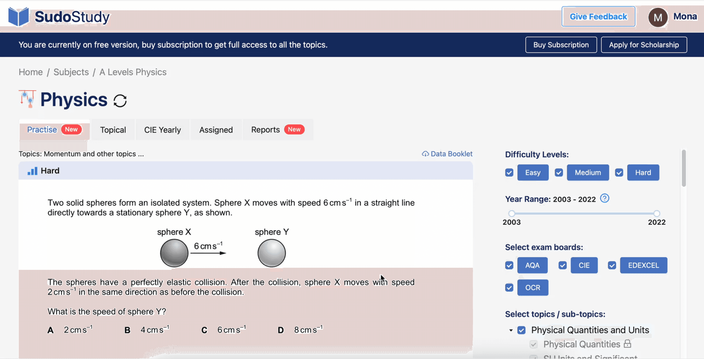 The original practice screen asked students to configure their own session, pick a difficulty, select a year range, choose an exam board, tick multiple topics, then start. For a student who just wanted to practice one concept, it felt like filling out a form before being allowed to learn.
