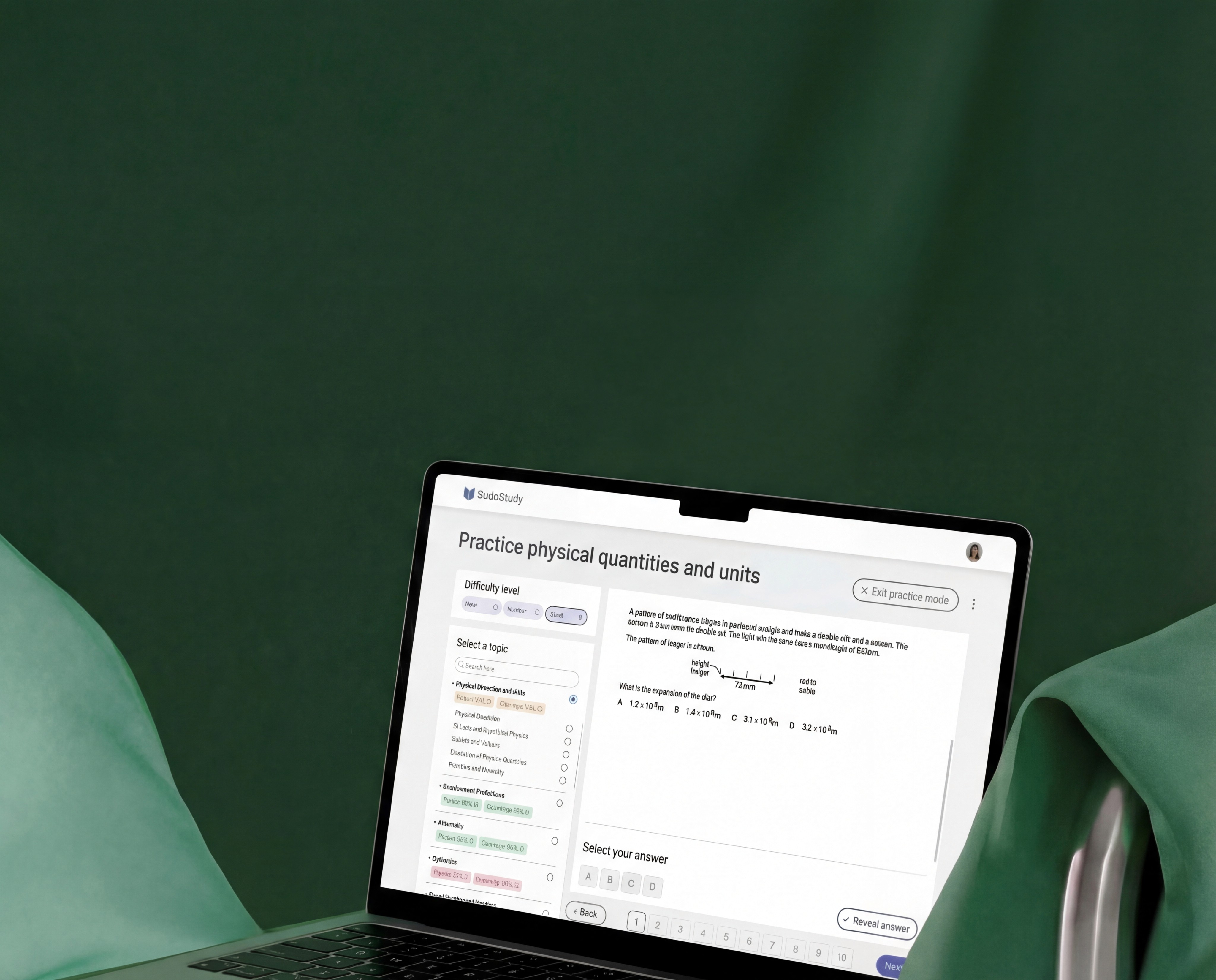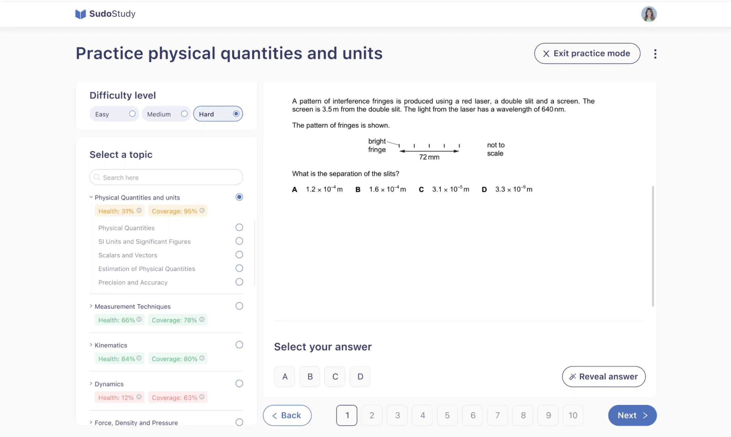 The filter-heavy sidebar became a progress map; each topic showing Health and Coverage scores so students can see where they need work. Multi-select became single-select. Distracting header CTAs were stripped entirely. A numbered question sequence with Back/Next controls replaced the old floating format, giving students position and momentum.