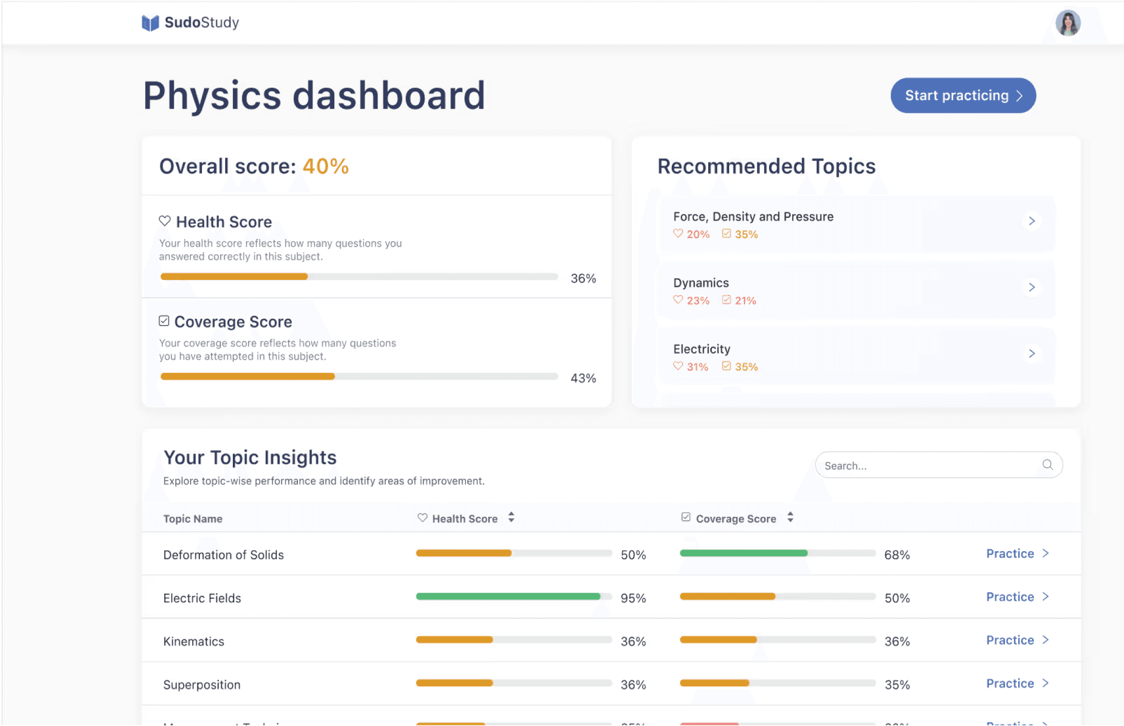 An overall score at the top gives instant orientation. Health Score and Coverage Score beneath it break performance into two actionable dimensions. A Recommended Topics section surfaces weak areas with one-tap access to practice — no guesswork.
